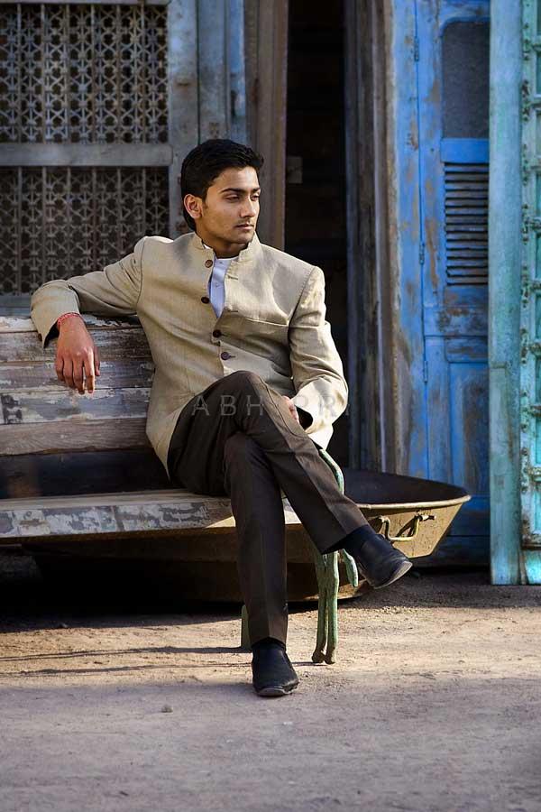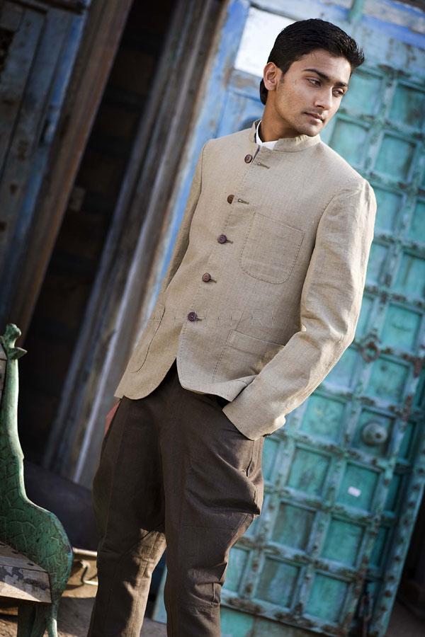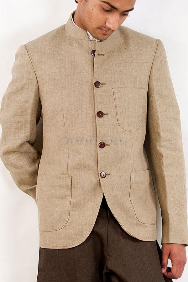 Featuring beige klassick bandhgala which has patch pocket, dark brown button and same colour thread hem stitch. This style is perfect for parties, social gatherings, and polo/golf matches.